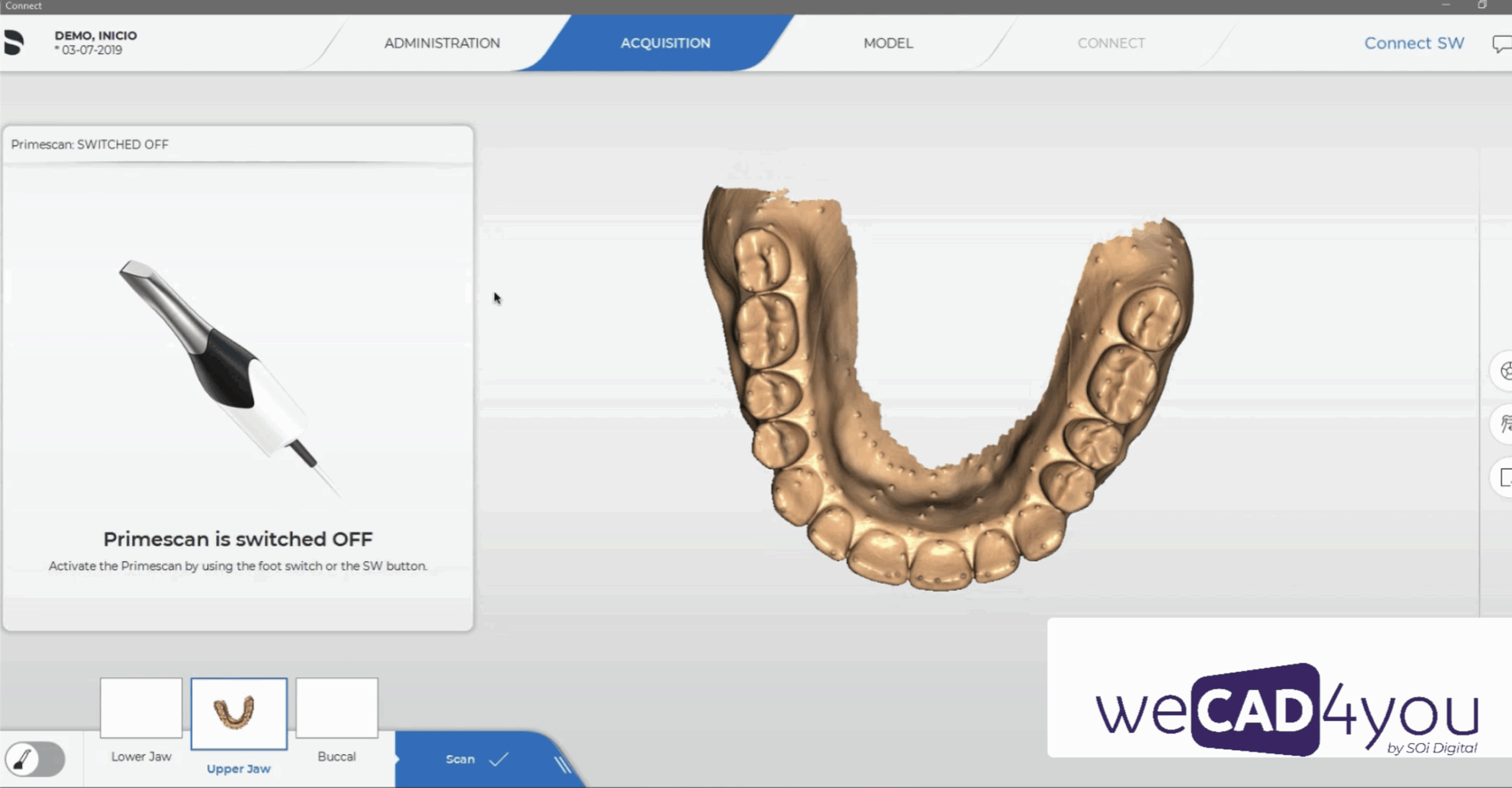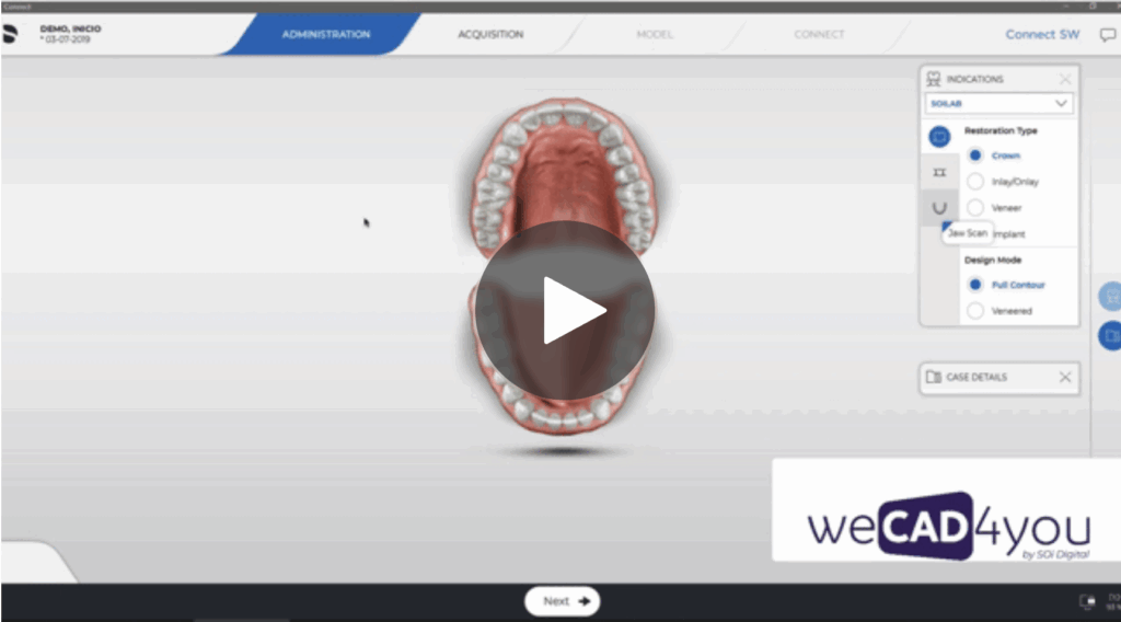 The CAI stage corresponds to the impression-taking process. But it goes beyond that: during this phase of the digital workflow, the occlusal vertical dimension (OVD) can also be recorded, and additional information can be incorporated to support the design and manufacturing of rehabilitative devices for our patients.
