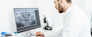 Experienced dental laboratory technician digitally designing a crown in CAD software on multiple screens, highlighting human precision and expert judgment over automation.