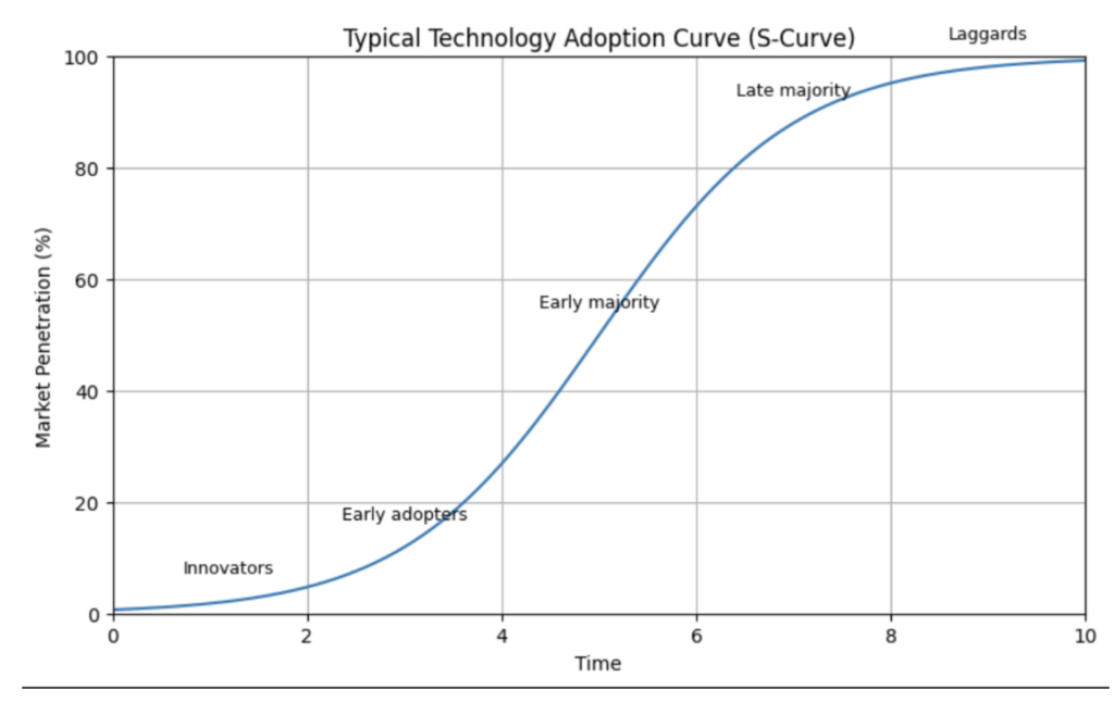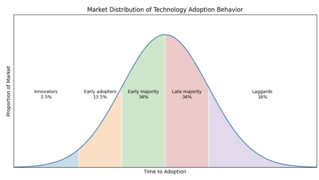 Before discussing the scope of this question and its possible answers, it is important to understand the following two curves, from whose graphs the different types of consumers or users of a new technology, as well as the timing with which they adopt it, can be derived: